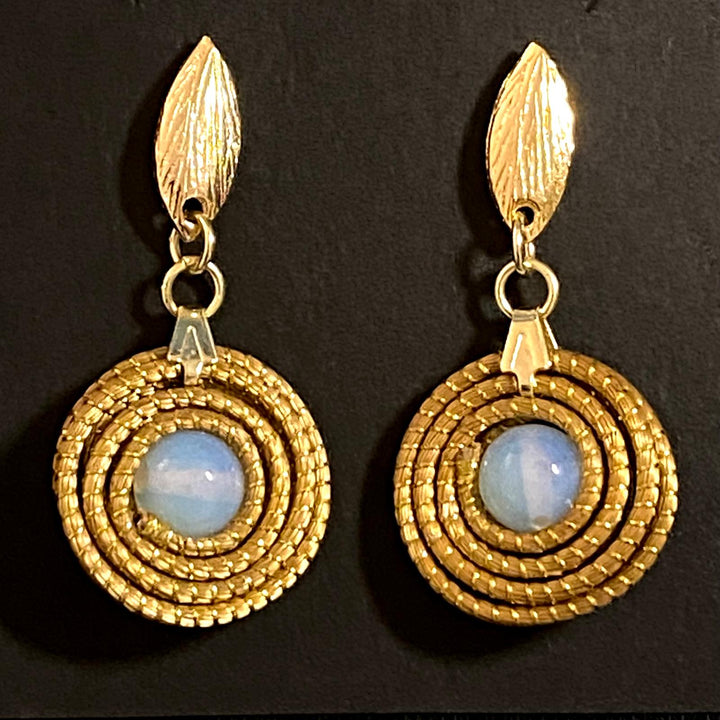 Paire de Boucles d'oreilles spirale en or végétal ornée d'une perle pierre de lune. Diamètre 2 cm