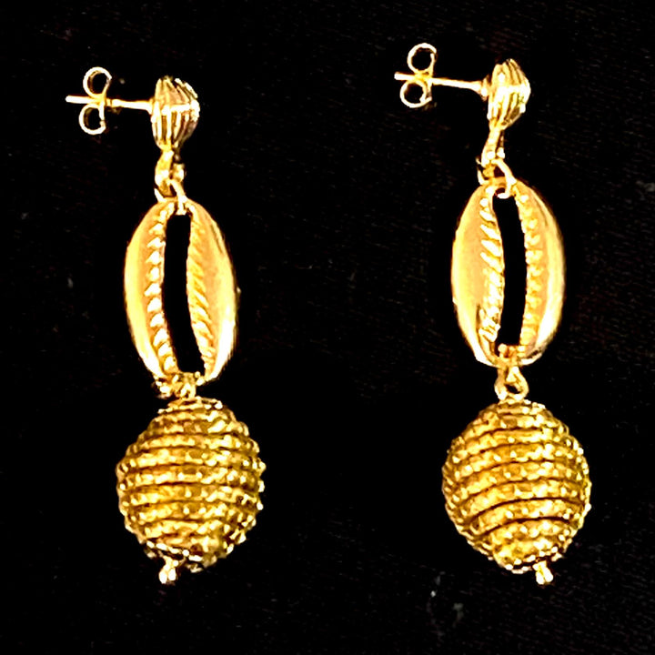 Charmante paire de Boucles d'oreilles composées d'une petite sphère en or végétal et d'un coquillage en métal plaqué or.