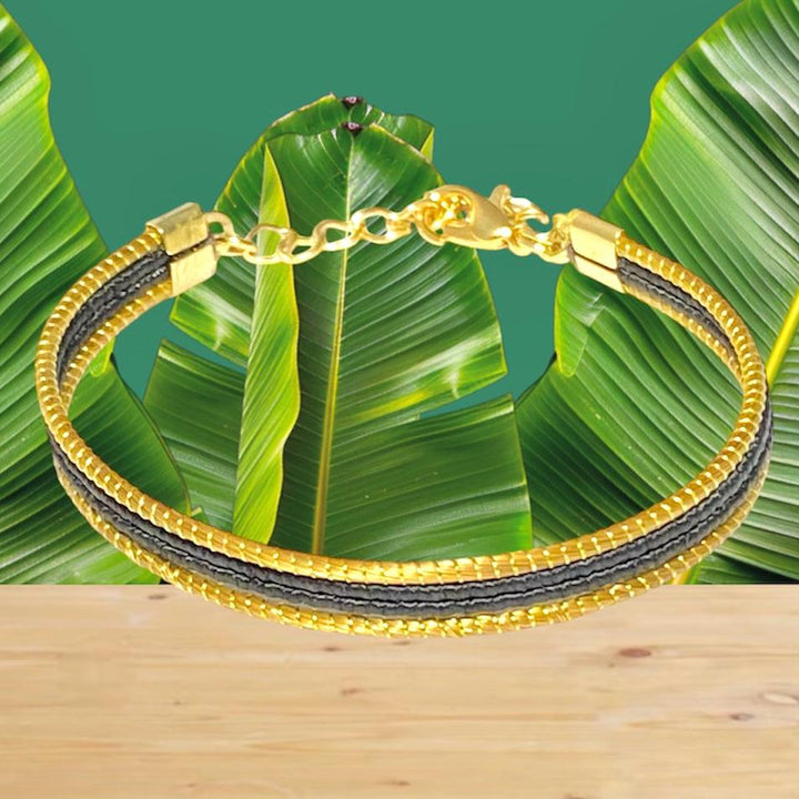Bracelet fin composé d'un détail central en fibre de buriti teinté en noir, orné de fils externes en or végétal. Chaînette et fermoir plaqués or.