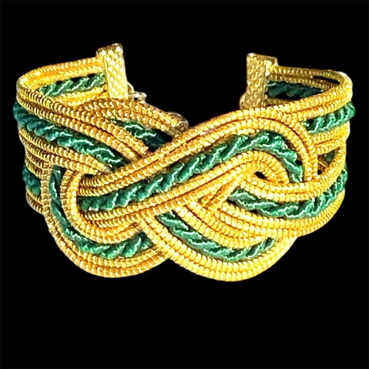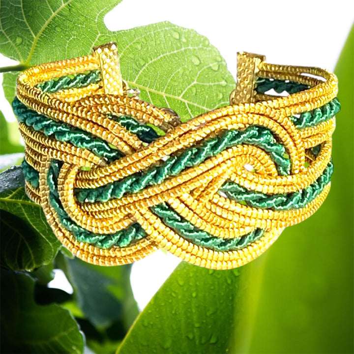 Bracelet en or végétal, symbole de l'infini, orné de détails en fibre de buriti teinté en vert, chaînette plaquée or.