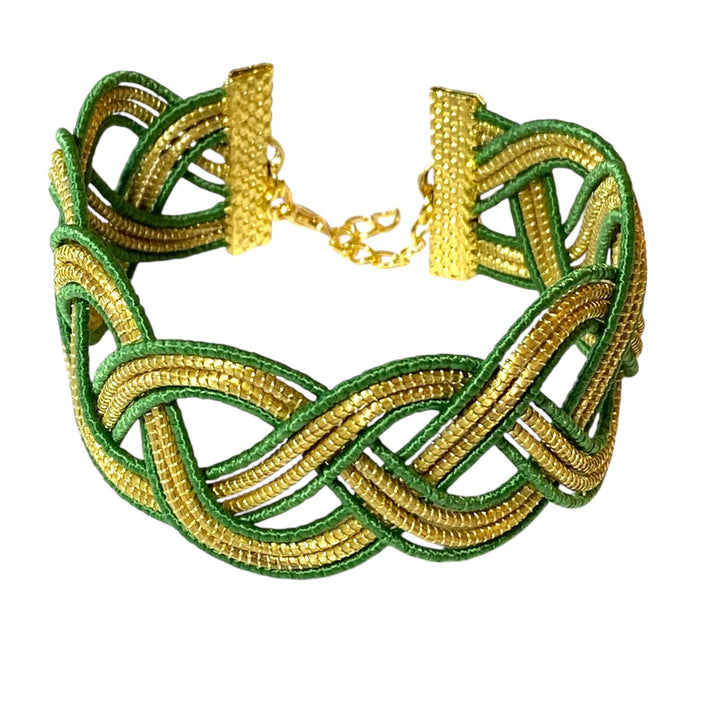 Bracelet en or végétal décoré d'une bordure de buriti naturel tenté vert. Chainette plaqué or.
