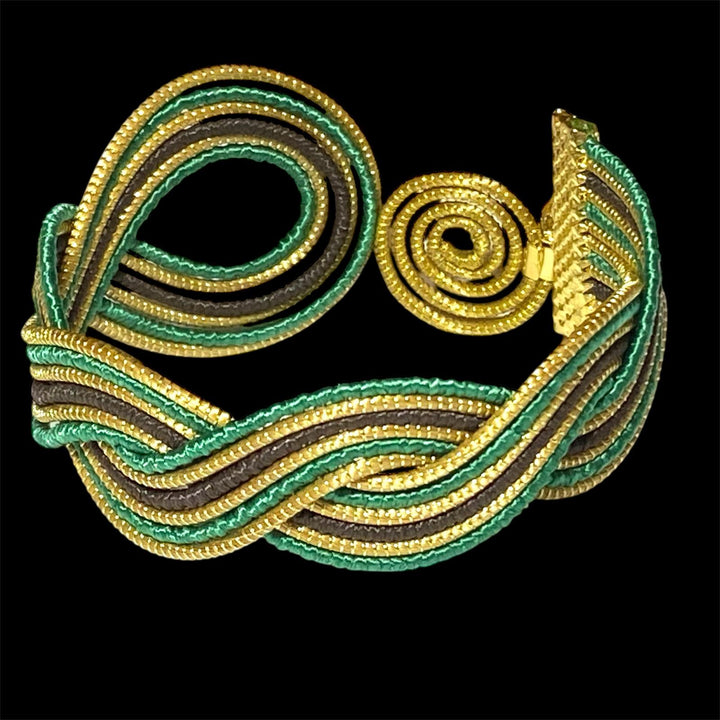 Bracelet large en or végétal et fibre de palmier buriti vert et marron