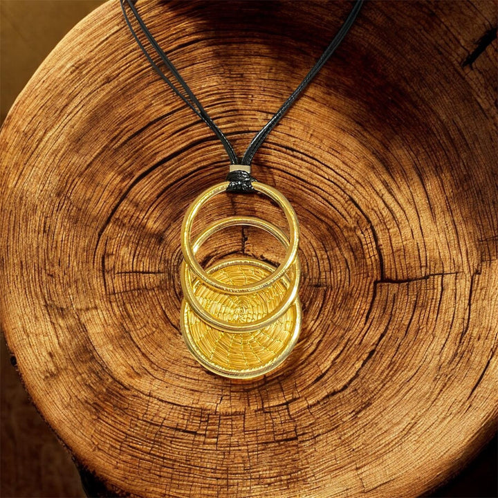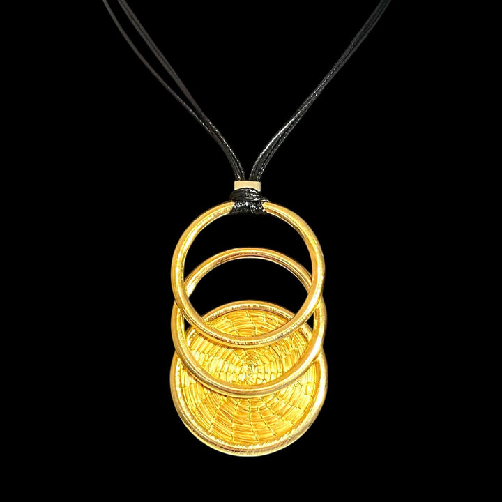 Design moderne pour cet élégant collier orné d'un médaillon en or végétal et de cercles métalliques plaqués or 3 microns.