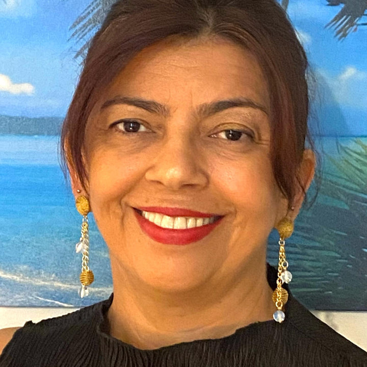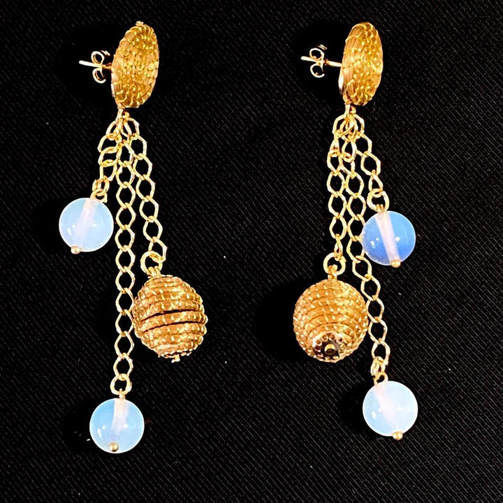 Paire de Boucles lobe et boule en or végétal ornée de perles en pierres de lune.
